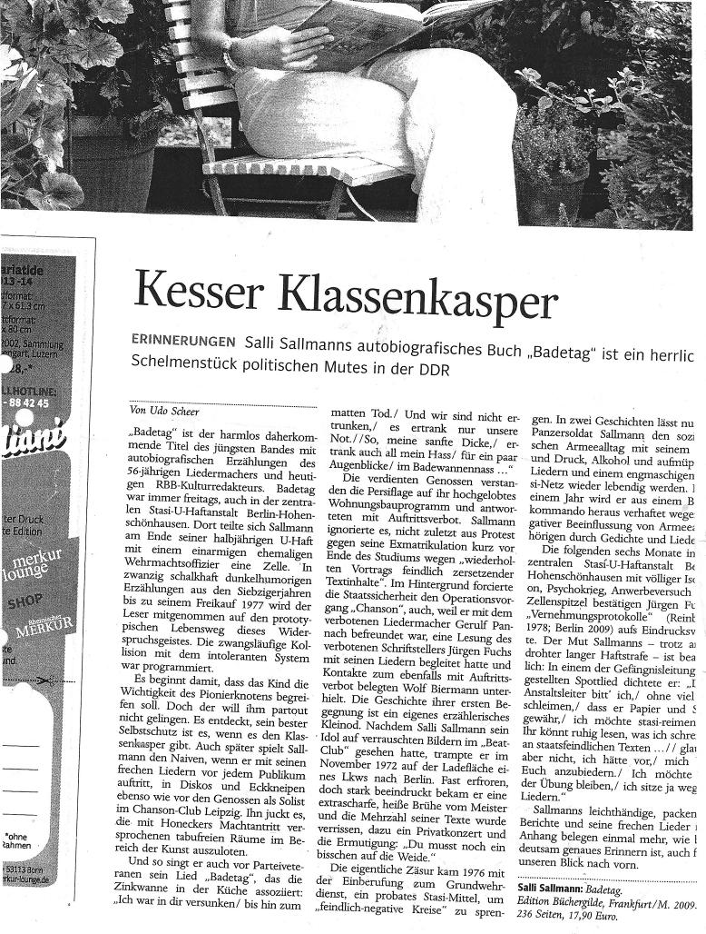 Salli Sallmann „Badetag” Welt am Sonntag, 1. November 2009 Von Karsten Krampitz Das Schwierige leicht erzählt, das Traurige komisch: Salli Sallmann blickt auf die DDR Freitags wird gebadet, auch in der alten DDR. Zur Not eben mittels einer Zinkwanne in der Küche, denn wer keine Innentoilette sein Eigen nennt, hat freilich auch kein Badezimmer. Um diesen republikweiten „Badetag“ dreht sich einer der Songs, für deren Vortrag der Liedermacher und Student Salli Sallmann in den 70er-Jahren erst aus dem Chansonclub Leipzig geworfen, von der Ingenieurshochschule exmatrikuliert und, nach gescheiterter Bewährung in der Produktion, aus dem Betrieb entlassen wird. Als er zur NVA eingezogen und eines Tages auf dem Appellplatz verhaftet wird, schließen sich die Kreise: Selbst im Stasi-Untersuchungsgefängnis Hohenschönhausen wird am Freitag zwar nicht gebadet, wohl aber geduscht. „Die Stasi stellt das Wasser an. Wir können nichts regulieren.“ Das Wasser sei mal heiß, mal eiskalt und dann wieder lau gewesen. Sein einarmiger Zellengenosse, ein in die Jahre gekommener Nazi-Kriegsverbrecher, habe sich weder Rücken noch gewisse andere Körperpartien waschen können. Für den Erzähler kein Problem: „Ich wasche für das Verfassen von staatsfeindlichen Gedichten dem Kriegsgefangenenmörder den Arsch.“ Nonchalant erzählt Salli Sallmann in „Badetag“ seine DDR-Geschichte, die den Biografien vieler Künstler ähnelt, die in Folge der Biermann-Affäre das Land verlassen mussten. „Ich will einen Sozialismus, aus dem keiner mehr abhauen will.“ Deshalb wurde der 1953 in Chemnitz geborene Salli Sallmann dann auch ausgebürgert. Davon schreiben andere auch, allen voran Biermann selbst. Was diese Erzählungen so interessant macht, ist nicht zuletzt die literarische Auseinandersetzung mit der Antifaschismusdoktrin in der DDR. Seine Chefin im Betrieb, eine verdiente SED-Genossin, sagt schon mal im Vertrauen: „... der Biermann, das ist doch ein Jude, stimmt‘s?“ -und die Juden seien schon immer darauf aus gewesen, Geld zu machen. Salli Sallmann aber richtet nicht nur andere; seine Erzählung „Judenarsch“ handelt von einem ostdeutschen Jugendphänomen, dem Aufbegehren mit Nazisprüchen: „Wenn die uns hier so schurigeln, kurze Haare, keine Westsender, Strammstehen beim Fahnenappell, wenn die hier im Staat so gegen Nazis sind, dann kann doch nicht alles an den Nazis so schlecht gewesen sein?“ Und so kommt es, dass der junge Sallmann selbst ein Mädchen beschimpft: Wie auch immer, „Badetag“ ist ein großartiges Buch. Das Schwierige wird leicht erzählt, das Traurige kommt komisch daher, und die Künstler und Intellektuellen sind nicht immer die Klügsten. Etwa in der Episode als Wolf Biermann beim Renft-Texter Gerulf Pannach anruft und ihm stolz berichtet, er habe begeisterte Zuschriften bekommen aus Leipzig. Damit nun auch wirklich alle Welt am Telefon Bescheid weiß, nennt Biermann die Namen, von wegen: „ihr seid nicht allein“. Dass er dabei abgehört wurde, ist fast schon wieder egal, denn die Stasi wird ja bereits die Briefe gelesen haben. Salli Sallmann erzählt nun, wie aus ihm und den Briefautoren erst ein Debattierzirkel, dann eine Schulungsgruppe und schließlich eine Art Seitensprungvermittlung wird. Salli Sallmann, von Hause aus Literaturkritiker beim RBB-Radio, hatte sicher gute Gründe, seinem Werk keine Gattungsbezeichnung beizugeben. Für eine Novelle läge zwar eine unerhörte Begebenheit vor, allerdings fehlt der Haupterzählstrang. Die Geschichten korrespondieren miteinander, doch ergeben sie eher ein Mosaik als eine organisch gewachsene Handlung. Die Herausgeber Ines Geipel und Joachim Walther, in deren Reihe der „Verschwiegenen Bibliothek“ der Band erschienen ist, geben vor, dass es sich um ein „wichtiges Zeitdokument“ handelt. Für die Lyrik und die Liedtexte mag das stimmen; ein Teil wurde in den Archiven der Birthler-Behörde gefunden und ein anderer vom Autor während der Haft auswendig gelernt und nach der Entlassung notiert. Doch wie verhält es sich mit der Prosa? Wenn die Herausgeber nicht explizit sagen, dass der Band mit dem Manuskript identisch ist, welches in der DDR oder kurz nach der Ausbürgerung 1977 geschrieben wurde, dann ist „Badetag“ kein Zeitdokument, eher eine in wunderbaren Geschichten erzählte autobiografische Dokumentation. Im Abrechnungszeitraum, dem sich Salli Sallmann widmet, hatte die DDR-Regierung die Schlussakte von Helsinki unterschrieben, sich also zur Achtung der Menschenrechte bekannt. Wie konnte es dennoch passieren, dass ein Mensch, der nicht gestohlen und nicht betrogen, gegen niemanden Gewalt angewendet hatte, über Monate im Gefängnis saß? So gründlich wie die Stasi, schreibt Salli Sallmann, habe sich noch kein Verlag und keine Zeitung mit seinen Texten auseinandergesetzt. Vielleicht erweitert sich ja mit „Badetag“ die Leserschaft.